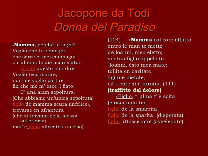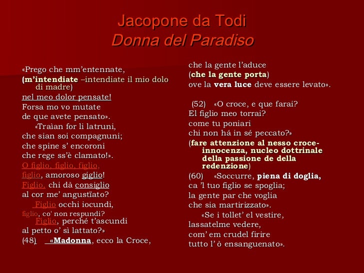 leggi l'articolo completo qui : https://www.ilconfronto.com/?p=324 «donna de paradiso, lo tuo figliolo è preso iesù cristo beato. A notable exception is the latin stabat mater dolorosa that has long been attributed to him. Accurre, donna e vide che la gente l'allide;( percuote) credo che lo s'occide, tanto l'ò compito fai la parafrasi della lauda;